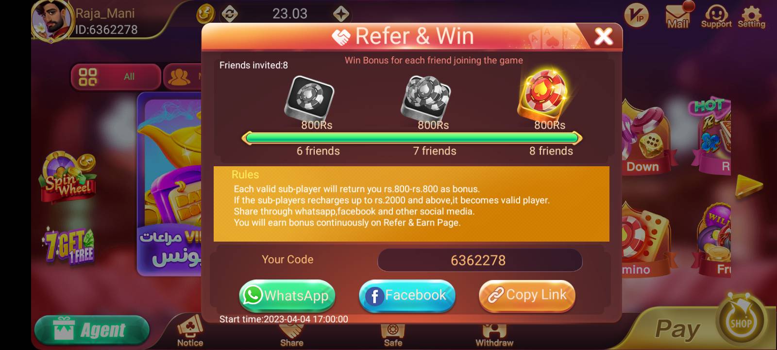 The referral system in 3 Patti No1 is one of its strongest features. You can invite friends through social media platforms such as Facebook, Telegram, and WhatsApp. Every time someone joins using your link, you receive a 30% commission on their gameplay. The more people you invite, the higher your earnings.