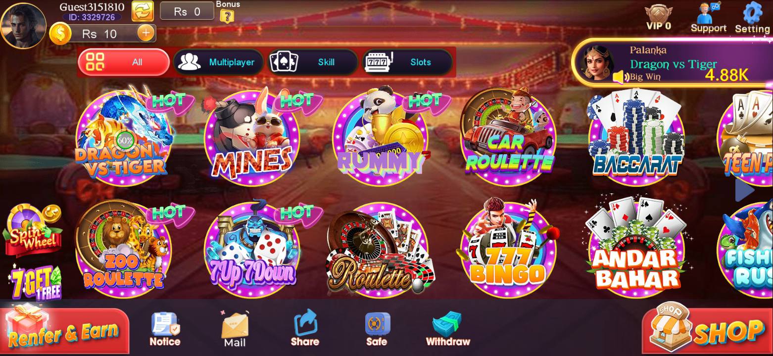 Teen Patti, Lucky Spin, and Slot Machine games usually offer higher rewards.